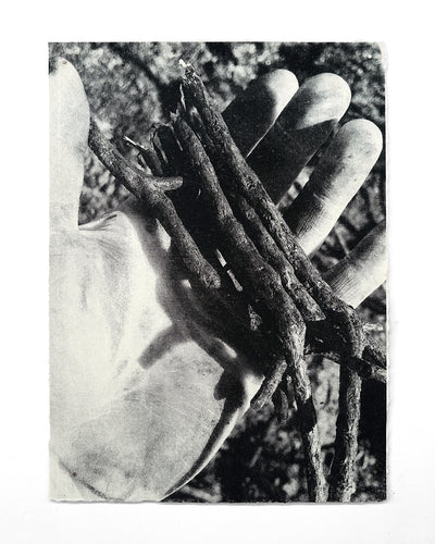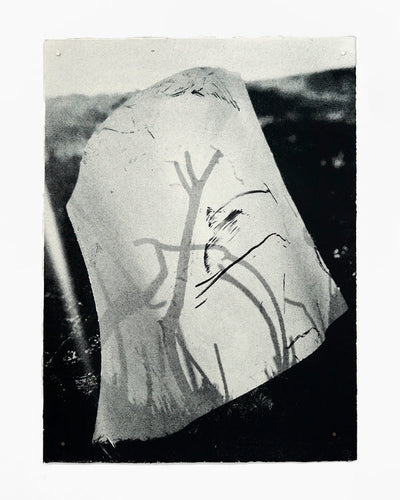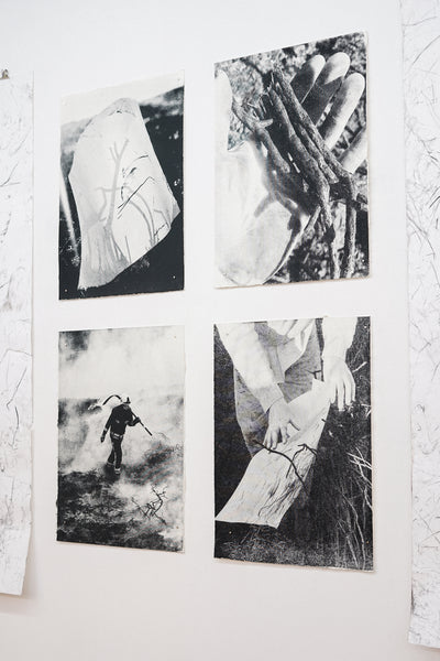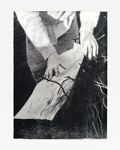 "A study of charred gorse on paper. These earthworks are the result of movement through burnt gorse, the accidental interaction of stick on cloth and skin, and subsequent compulsion to index the marks on paper. Sculptural and photographic, the sheets are torn by the wind and projected by sunlight, gorse branches scratched past incidental stains morphed from inconvenience to involvement. Pulled by the eternal draw of smoke and fire, the work is a synch to primal humanity." — Jack Whitefield